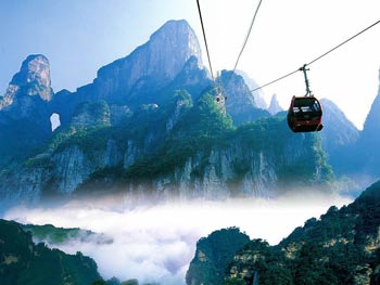 車廂式索道,猶如一道彩虹飛渡“人間” “天上”,又象一條巨龍騰翔素云蒼穹,依山籍壁,拔地沖天,蕩氣回腸,恢宏壯觀,成為天門山旅游風景區(qū)“四大奇觀”之一。