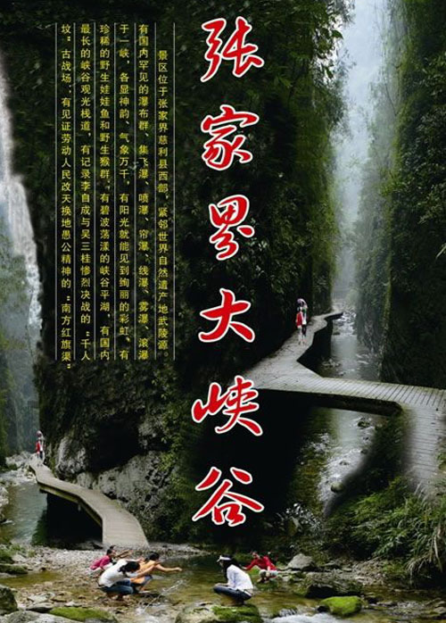 早7-8點左右市區(qū)定點集合點集合,游覽【張家界大峽谷】峽谷間是一條清幽的小溪,沿溪邊是用木板搭建的游道, 張家界大峽谷峽谷內(nèi)不僅有傳統(tǒng)的秀美自然風(fēng)光,還云集有三朝數(shù)代的歷史人文景觀,如記錄李自成與吳三桂慘烈決戰(zhàn)的“千人墳”古戰(zhàn)場,反映湘西歷史特色的土匪洞及見證解放初期湘西人民靠天勞作在絕壁間挖鑿的“南方紅旗渠”等。 |